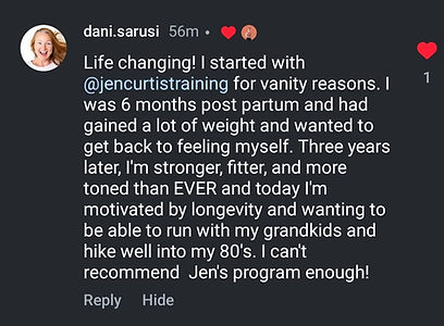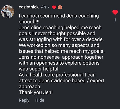 Jen not only helped me lose FIFTY POUNDS and return to my pre-pregnancy weight after 3 babies, but helped me heal my relationship with food. I lost all the weight while eating my favourite sweets without feeling guilty, cutting anything out, or binging"